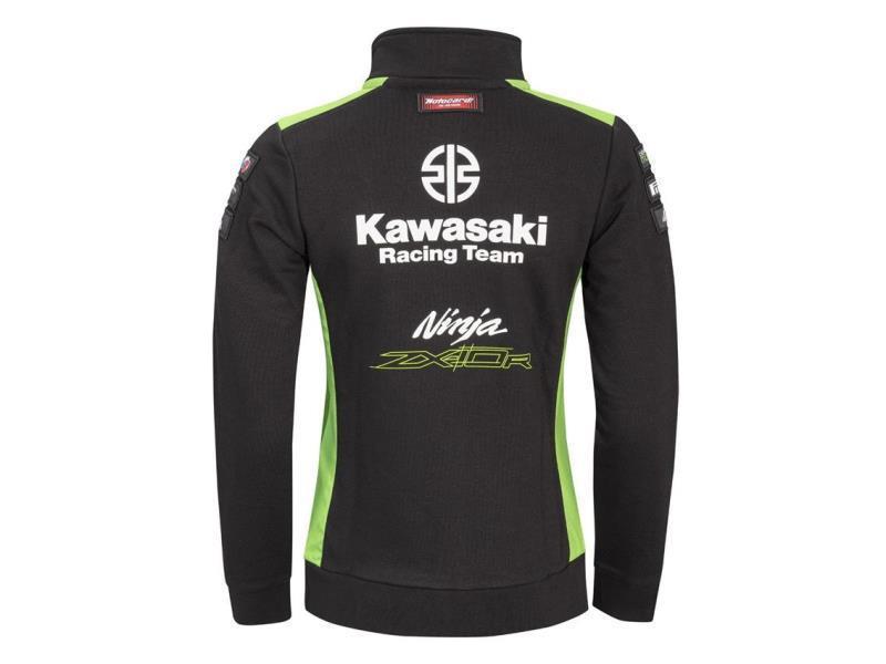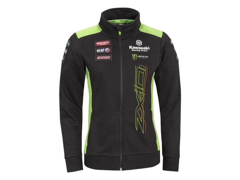 Felpa con zip nella colorazione ufficiale del team Kawasaki WSBK 2023 con tasche esterne, collo alto e polsini a coste.