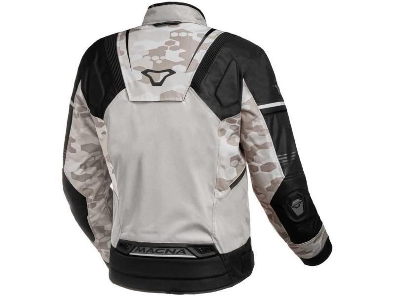 Giacca Macna Adept Camo Beige / Nero. Giacca multiuso realizzata in tessuto di poliestere Fybrex che offre durata e resistenza superiori. Una membrana impermeabile fissa ti mantiene asciutto, mentre la fodera termica rimovibile e le prese d'aria Airscoop ti permettono di adattarti alle condizioni meteorologiche. Incorpora protezioni su spalle e gomiti con certificazione CE e predisposizione per paraschiena e paratorace per un'eccellente sicurezza su strada.