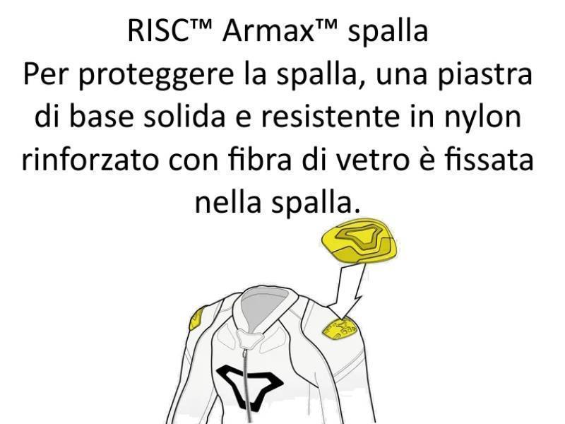 I nostri protettori RISC™ di livello 1 sono presenti sulle spalle e sui gomiti. I protettori RISC™ per la schiena e il petto sono disponibili separatamente e possono essere facilmente inseriti nell'apposito scomparto. Prima di acquistare un protettore per la schiena, controllare la tabella delle taglie.