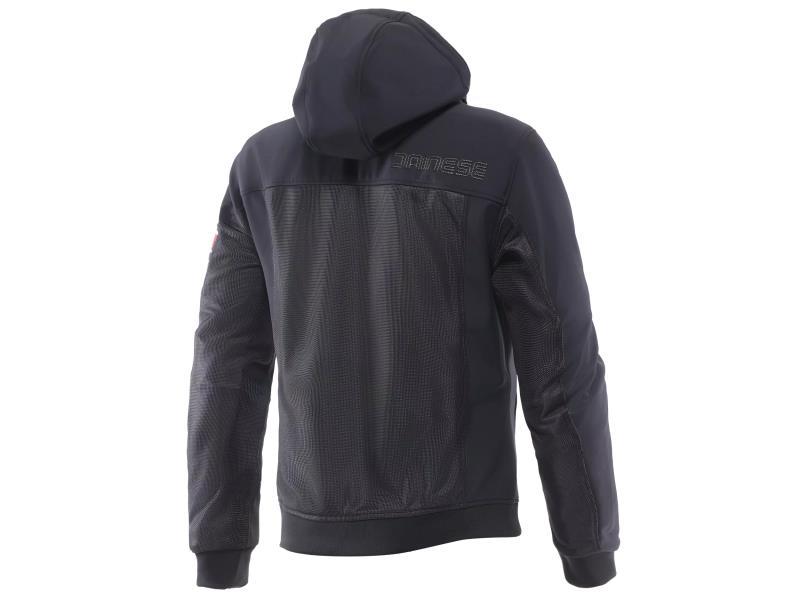 Giacca da moto da uomo con cappuccio, realizzata in morbido tessuto Softshell e dotata di ampie pannellature in mesh, progettata per garantire massima ventilazione e comfort nelle giornate più calde.