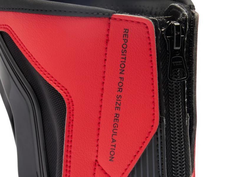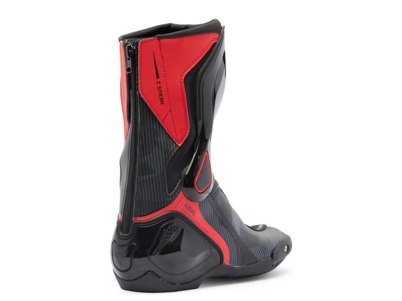 Stivali moto sportivi con sistema Axial Distorsion Control System per la protezione della caviglia e slider termoplastici sostituibili.