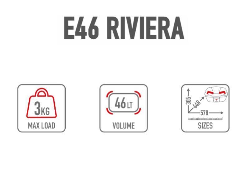 Il RIVIERA offre di serie un tappetino morbido removibile, fissato al fondo con chiusura a strappo, e può contenere due caschi, anche modulari (di dimensioni medie, come il GIVI X.21). Lo spazio interno permette di ospitare la borsa morbida GIVI T502B (optional). La serratura è compatibile con la chiave Security Lock SL101 (optional). Il top-case è predisposto per l’applicazione dello schienale E207 e per contatti elettrici utili al funzionamento di accessori optional futuri. L’impermeabilità è ottima: il prodotto è stato testato sia in laboratorio sia su strada sotto tempesta e grandine.
