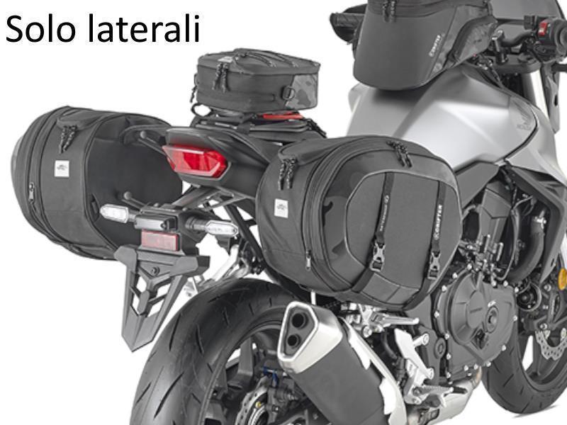 Prima dell'acquisto verificare, tramite personale qualificato, la possibilità di montaggio sul proprio veicolo.Coppia di borse laterali universali, 40 lt. che possono essere montate su qualunque moto o scooter. I telaietti non sono necessari per il montaggio delle borse, ma sono altamente consigliati sia su moto che su scooter per distanziare le borse dalla ruota e dagli scarichi