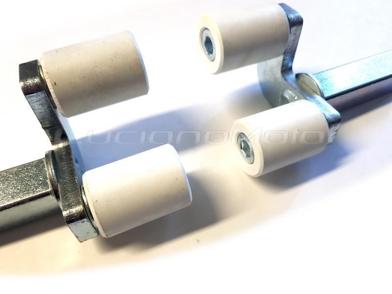 Prima dell'acquisto verificare, tramite personale qualificato, la possibilità di montaggio sul proprio veicolo.Attacchi anteriori a rulli basculanti in teflon. Adatti al cavalletto anteriore universale e specifici per moto senza fori sotto le forcelle anteriori. Universali e adattabili a tutte le altre moto.