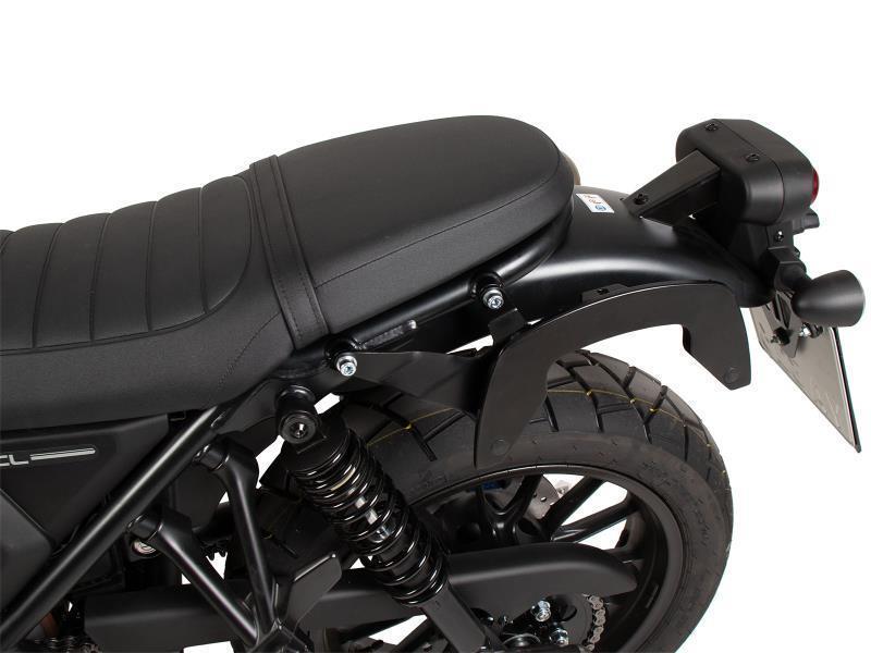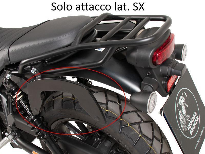 Il portaborse C-Bow è realizzato per accogliere una varietà di borse Hepco&Becker, a seconda del modello di moto. Borse morbide per moto sportive e dinamiche e borse laterali per chopper e cruiser possono essere fissate alla moto con il supporto C-Bow. Il suo design elegante e discreto si adatta perfettamente alle linee generali del veicolo. Naturalmente, mantiene le borse laterali al sicuro lontano dal silenziatore di scarico caldo. La moderna tecnologia C-Bow consente di fissare le borse giuste in modo semplice e facile al C-Bow con un solo clic, bloccandole saldamente per scoraggiare i furti. Le borse sono fissate saldamente alla moto e rimangono in posizione anche quando sono caricate. Su molti modelli gli indicatori di direzione rimangono nella posizione originale. Si prega di consultare il manuale per maggiori informazioni.
